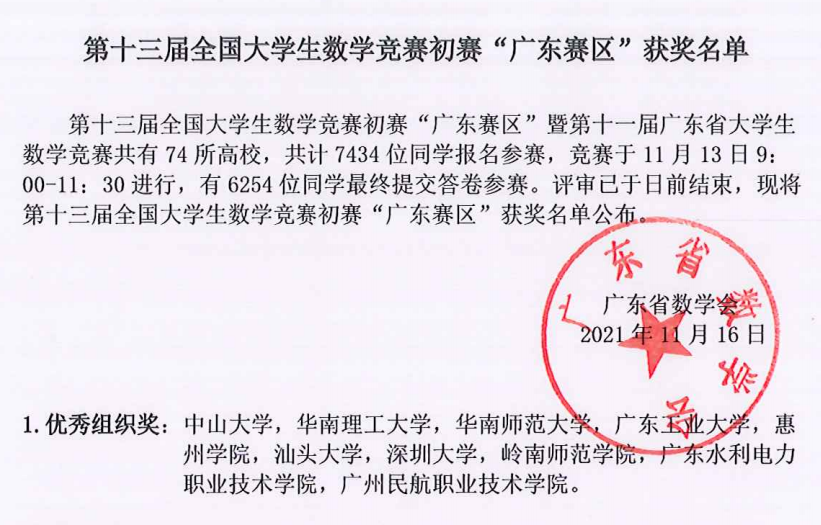(基础教学部、学工部供稿)近日,由中国数学会组织、广东数学会与广东工业大学承办的2021年第十三届全国老员工数学竞赛初赛(广东赛区)暨第十一届广东省老员工数学竞赛结果出炉。在学工部、各二级学院的大力支持下,我部刘卫斌老师积极动员广老员工实训备战,精心组织指导队员赛出水平,赛出风采,再次实现获奖等级与数量的历史性突破!